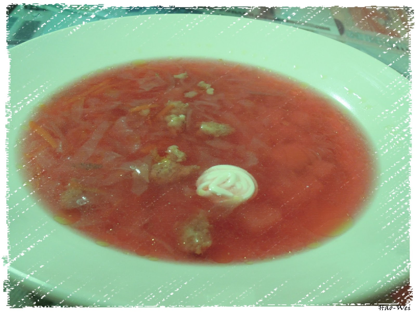 首先上菜的是今日甜湯。這應該是甜菜根湯,而那一坨白色的應該是奶油。這湯給我的感覺倒是還好,因為在很多的西式餐廳都可以吃的到。味道滿清淡的,無怪乎餐桌旁有一小罐鹽,可能是讓味道覺得不夠的人加的。